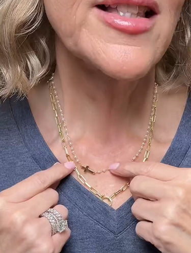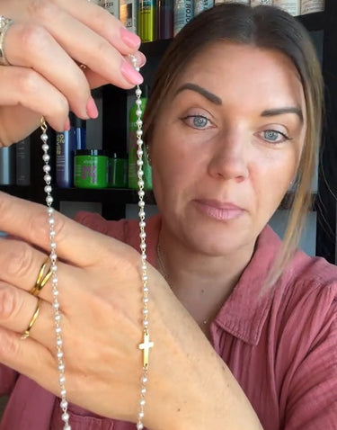 "The necklace feels high quality. This is my go to necklace now, and I love the way the pearl and cross looks together. Obsessed!"
